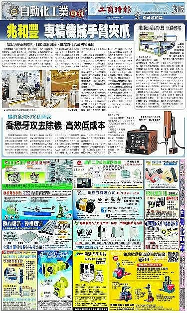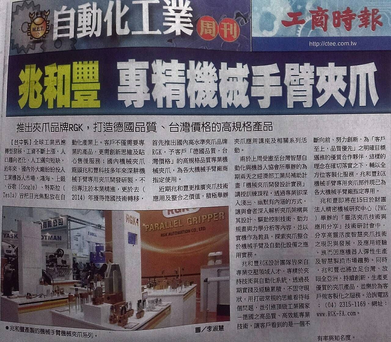 感謝2015-05-11工商時報於自動化周刊報導兆和豐科技,原本就以專精研發優質夾爪聞名,更於2014年獲得德國技術轉移,推出高水準的夾爪品牌兆銘弘RGK,在地台灣製造生產,提供給客戶與德國相同品質的夾爪產品,卻只需要台灣的價格。