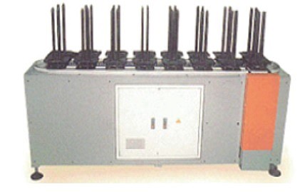 托盤由鍊條帶動,托盤導桿可同動調整工件圈圍尺寸。 工件由電動升降機構托載昇降到固定位置,以便手臂取料。